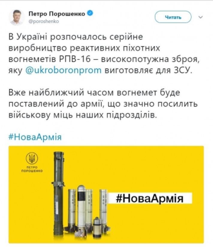 "В Украине началось серийное производство реактивных пехотных огнеметов РПО-16 — высокомощного оружия, которое Укроборонпром производит для ВСУ. Уже в ближайшее время огнемет будет поставлен в армию, что значительно усилит военную мощь наших подразделений",