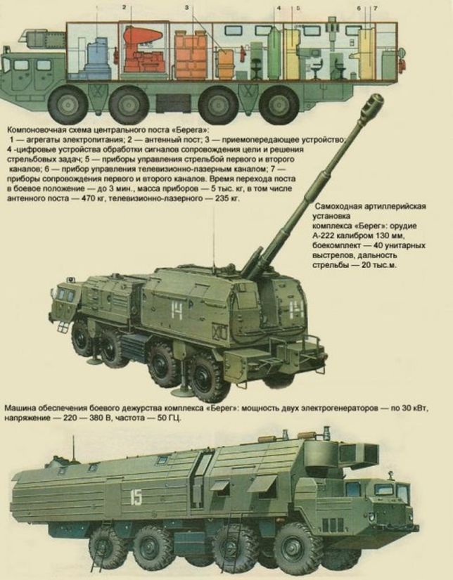 В Советском союзе для охраны побережья, кроме ракетных противокорабельных комплексов использовали и артиллерийские комплексы. Как и ПКРК, арткомплексы были мобильного и стационарного исполнения. 130 мм мобильный комплекс СМ-4, к концу 70 годов морально устарел – низкие характеристики мобильности, устаревшая аппаратура систем управления, делали его малопригодным для выполнения современных задач по обороне Советского побережья. В 1976 году начинаются работы по созданию новейшего 130 мм мобильного комплекса А-222 под названием «Берег». Основной разработчик центральное конструкторское бюро «Титан», производитель ПО «Баррикады».