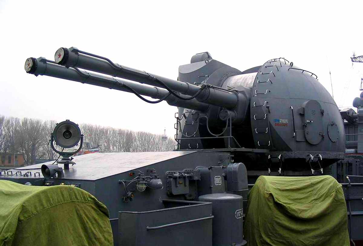 Скорострельная зенитная артиллерия, предназначенная для самообороны корабля от крылатых ракет в ближней зоне ПВО, представлена двумя батареями 30-мм зенитных артиллерийских комплексов АК-630М (по одной батарее с борта). В составе каждой батареи имеется две шестиствольные артиллерийские установки с вращающимся блоком стволов водяного охлаждения и одна СУ «Вымпел». Эффективная дальность стрельбы — до 4 км, темп стрельбы — 4000 выстр./мин, общий боезапас — 16 000 выстрелов. Наведение автоматов АК-630 осуществляется исключительно дистанционно от РЛС «Вымпел», либо от визирной колонки. При своих выдающихся боевых характеристиках батарея из двух АК-630М из-за худших возможностей РЛС, а также из-за размещения последней на значительном удалении от оси стрельбы уступала по точности стрельбы одной 20-мм ЗАУ Mark 15 Phalanx CIWS. Расчётное количество поражаемых одной батареей АК-630 противокорабельных ракет «Harpoon» оценивалось в середине 1970-х годов в 0,4-1,0 единиц.