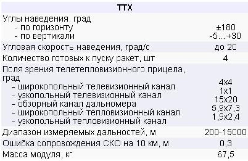Автоматическая пусковая установка с размещенными на ней готовыми к пуску четырьмя управляемыми ракетами оснащена телетепловизионным прицелом с телевизионными камерами высокого разрешения и тепловизором третьего поколения, встроенным лазерным дальномером и лазерным каналом наведения ракет, а также автоматом сопровождения целей с приводами наведения.