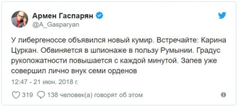 Едва успел «остыть» скандал с отравленным британским агентом Сергеем Скрипалем, как между Россией и Западом, похоже, разгорается другой шпионский скандал. 19 июня, пару дней спустя после открытия ЧМ-2018, Лефортовский суд объявил об аресте некой Карины Цуркан по подозрению в шпионаже. 43-летняя женщина подозревается ФСБ в передаче данных Румынии о переговорах России по организации поставок электричества в Крым и ЛНР.