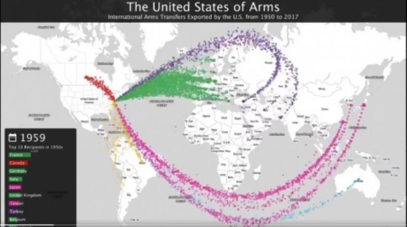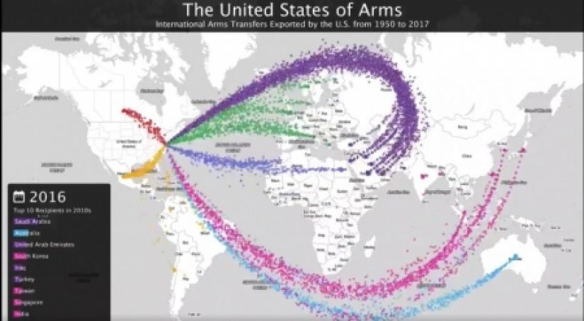 В любом случае, как показывает история, основные потребители американских вооружений находятся там, где Вашингтон раскручивает или втягивается в конфликты. Блогер-специалист по данным и их визуализации Will Geary даже создал видеоролик, на котором показал основные направления поставок американских вооружений за последние 67 лет. Он использовал данные Стокгольмского института исследований проблем мира (SIPRI), который отслеживает торговлю оружием. «США — крупнейший экспортер вооружений и мне было любопытно посмотреть, как это выглядит сквозь время. Поэтому я нанес потоки торговли оружием с 1950 до 2017 года на карту», — объяснил блогер.