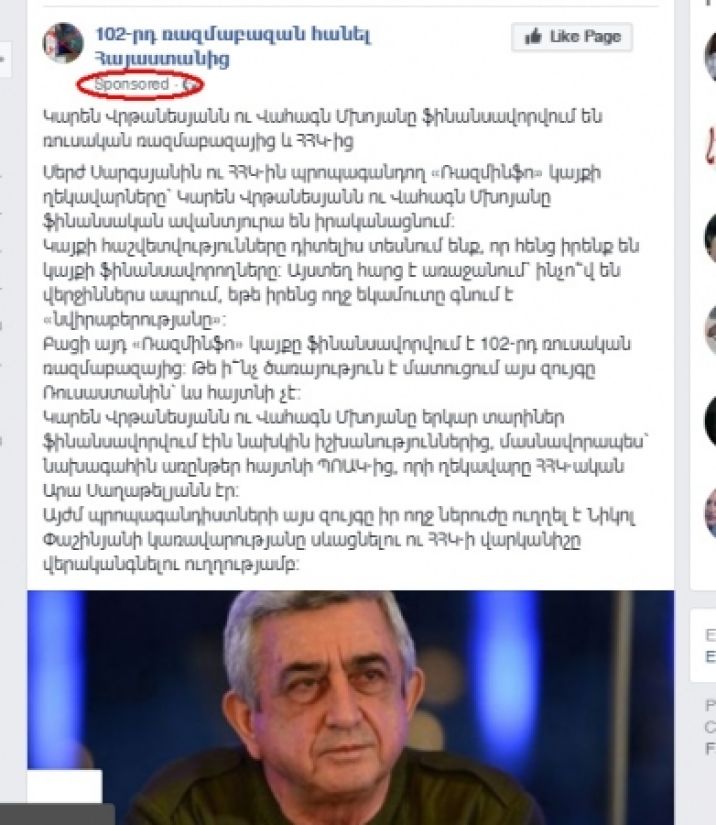На странице в сети Facebook делается попытка отождествить военную базу, защищающую безопасность Армении и армянского народа, с образом осужденного Валерия Пермякова, который в январе 2015 года жестоко расправился с семьей местных жителей. Также размещаются издевательские карикатуры на российского президента Владимира Путина.