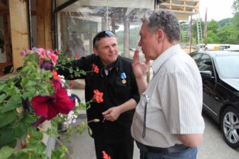 Полковник запаса Герой России Александр Маргелов беседует с русским добровольцем, воевавшим на Балканах, Сергеем Сухаревым.