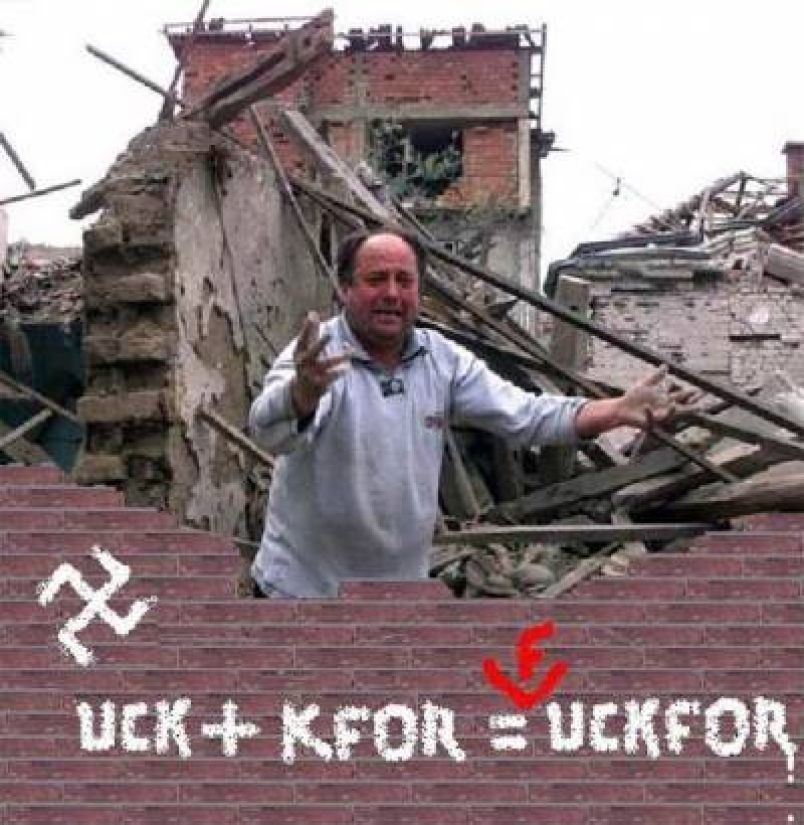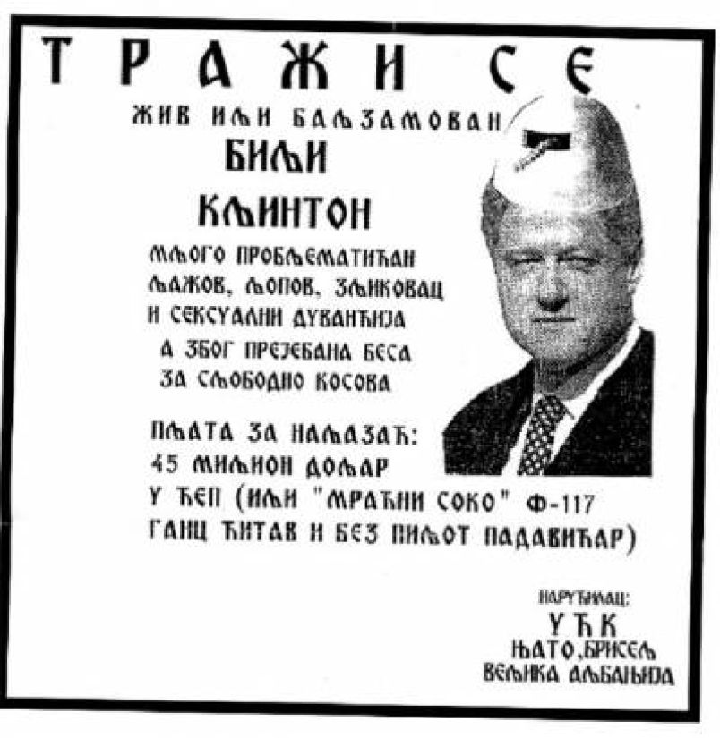 Листовка на сербское и албанское население КОСОВО, подготовленная и распространенная неизвестными лицами в апреле-мае 1999 г.: НАХОДИТСЯ В РОЗЫСКЕ живой или забальзамированный БИЛЛИ КЛИНТОН очень опасный преступник, вор-рецидивист, сексуально озабоченный, хотя, на самом деле, довольно беспомощный в половом отношении человек, протрахавший данную албанцам клятву освободить Косово. Вознаграждение за поимку: 45 миллионов долларов в карман (или самолет Ф-117 "Черный сокол" в хорошем состоянии и без пилота). Имеющуюся информацию просим сообщить по адресу: Армия освобождения Косово, НАТО, Брюссель, Великая Албания. Примечание: листовка написана на сербо-хорватском языке, но с использованием транскрипции, воспроизводящей албанское произношение.
