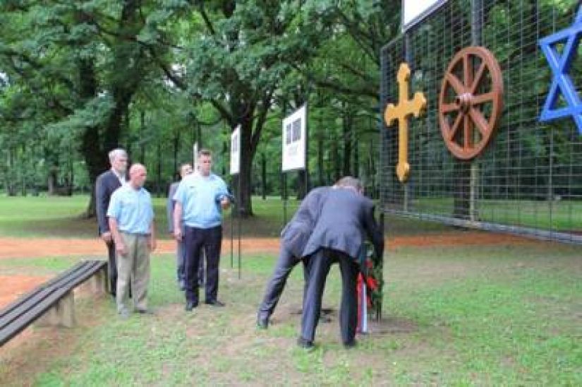 Российские десантники возлагают венок у мемориала на месте концлагеря Ясеновац, где в годы Второй мировой войны хорватские усташи замучили около 700 тыс. человек.