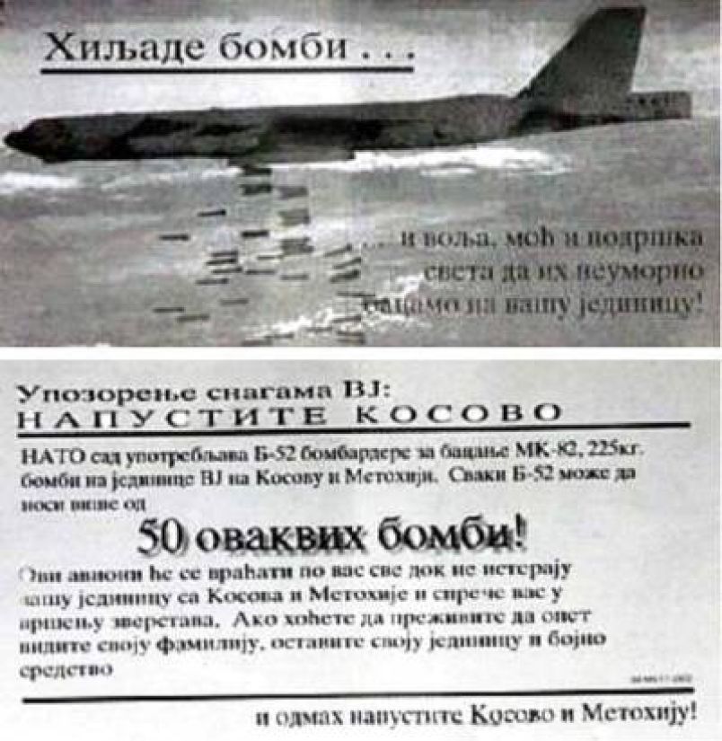Листовка для военнослужащих ВС СРЮ в КОСОВО, распространявшаяся авиацией НАТО в марте-июне 1999 г. Подпись на иллюстрации: "Тысячи бомб…повинуясь воле всего мира, будут беспрерывно сыпаться на ваше подразделение". Подпись на обороте: "Предупреждение ВС СРЮ: ПОКИНЬТЕ КОСОВО! НАТО использует против подразделений ВС СРЮ в КОСОВО и МЕТОХИИ бомбардировщики Б-52, вооруженные 225-килограммовыми бомбами МК-82. Один Б-52 может нести до 50 таких бомб! Эти самолеты будут прилетать до тех пор, пока не прекратят ваши зверства и не выгонят вас из КОСОВО и МЕТОХИИ. Если хотите выжить и снова увидеть свои семьи, бросайте оружие"