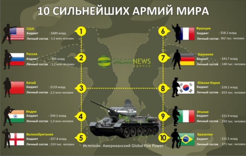 Американский исследовательский центр "Global Fire Power” обнародовал список 10-ти самых сильных армий мира. Американский центр, проводя анализ, принял во внимание 40 основных факторов.