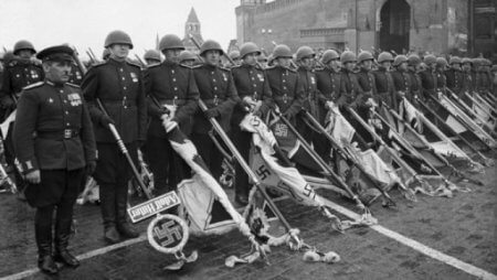 Страна празднует Победу. Звучит гимн Советского Союза. Гитлеровские знамена брошены к подножию Мавзолея. Это - символ сокрушительного поражения немецких войск, которые именно так хотели бросить к ногам своего фюрера всех русских людей, но не смогли.