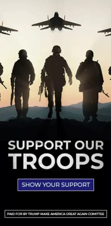 На плакате с призывом "Поддержи наши войска" изображены несколько силуэтов военных с оружием, на фоне которых летят три истребителя.
