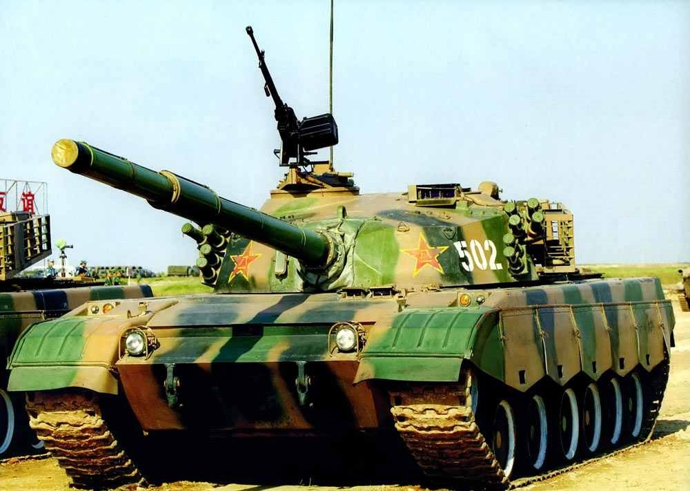 Башня сварена из катаных и литых деталей и имеет в лобовой части модульную конструкцию, что значительно облегчает замену элементов бронирования. Лобовые модули – со специальными кронштейнами для быстрой замены, а в верхней части каждого блока (скулы) расположена одна заглушка для заполнения керамическим наполнителем. В нише кормовой части башни – электронный блок баллистического вычислителя, боекомплект к пулеметам и часть ОПВТ. На крыше размещены радиоантенна и датчик ветра. Внутренняя компоновка боевого отделения полностью аналогична компоновке советского танка Т-72. В башне располагаются только два члена экипажа – наводчик (сидит слева от орудия) и командир (справа). В качестве основного вооружения используется 125-мм гладкоствольная пушка, представляющая собой российскую 2А46, которую китайская компания NORINCO скопировала и освоила в производстве. Пушка имеет эжектор и оснащена съемным термоизолирующим кожухом. Углы вертикального наведения орудия составляют от -6 до +14 градусов, длина ствола – 51 калибр, дальность прямого выстрела БПС – 2500 метров. Стабилизатор вооружения также скопирован с российского 2Э28 «Сирень», он управляется при помощи специального пульта и позволяет вести с ходу достаточно точную стрельбу по неподвижным и движущимся целям. Электрогидравлические приводы наведения дублированы для командира и наводчика. Вместе с пушкой китайской промышленностью освоены и 125-мм боеприпасы к ней: кумулятивный, бронебойно-подкалиберный и осколочно-фугасный. Выстрелы имеют раздельно-гильзовое заряжание и частично сгорающую гильзу (с несгорающим поддоном).