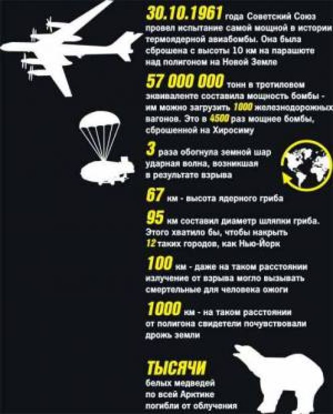 АН602 (она же «Царь-бомба», она же «Кузькина мать») — термоядерная авиационная бомба, разработанная в СССР в 1954—1961 гг. группой физиков-ядерщиков под руководством академика Академии наук СССР И. В. Курчатова. Самое мощное взрывное устройство за всю историю человечества. По разным данным имело от 57 до 58,6 мегатонн тротилового эквивалента. Дефект массы при взрыве достигал 2,65 кг. Полная энергия взрыва оценивается в 2,4·1017 Дж.