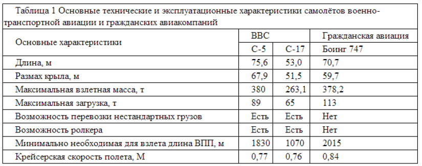 Основные технические и эксплуатационные характеристики самолетов ВТА и гражданских авиакомпаний (на примере Боинг 747 как наиболее распространенного типа) приведены в таблице 1.