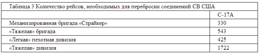 Общее время доставки груза с континентальной части США в передовую зону определяется продолжительностью первых четырех этапов рассматриваемой схемы и составляет для самолета типа С-17А около 6 сут (длительность этапа подготовки к боевому применению принята одинаковой). В зависимости от объема перевозимого груза для переброски отдельных соединений сухопутных войск США в зону конфликта требуется, как правило, сотни рейсов самолетов ВТА (таблица 3), а время переброски будет определятся количеством привлекаемых к переброске воздушных судов.