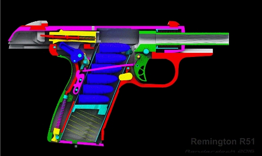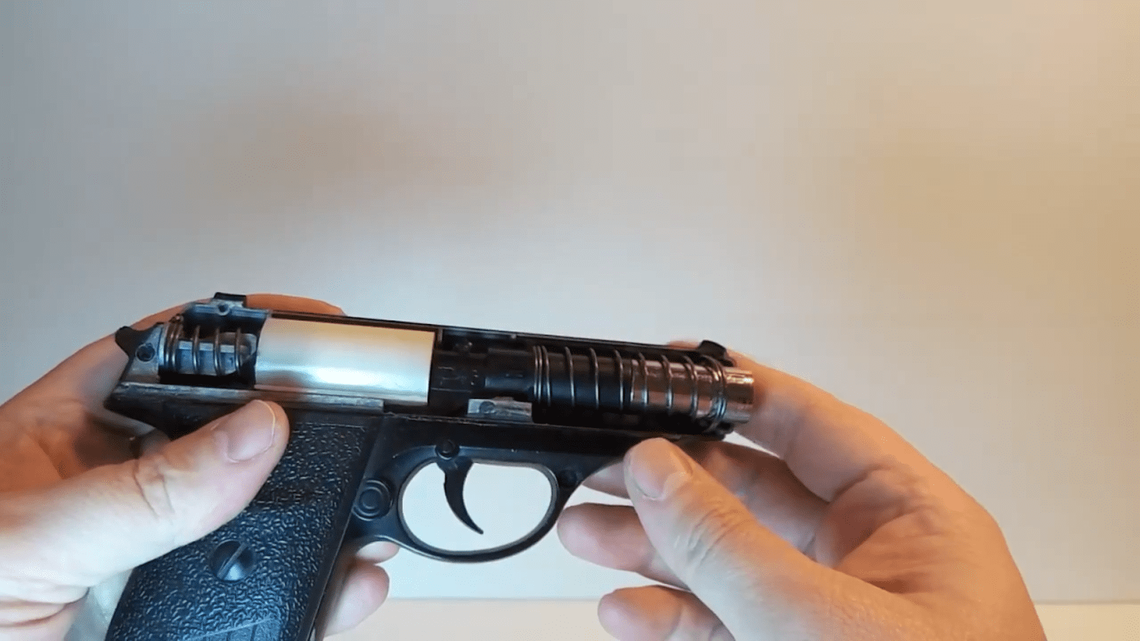 Чтобы выстрелить, необходимо передернуть затвор. Это верхняя часть пистолета. Когда мы отодвигаем затвор назад, нижняя пружина в магазине выталкивает шар вверх в освободившееся место. Верхняя пружина толкает затвор обратно. Тогда патрон попадает в муфту ствола. Итог — пистолет заряжен.