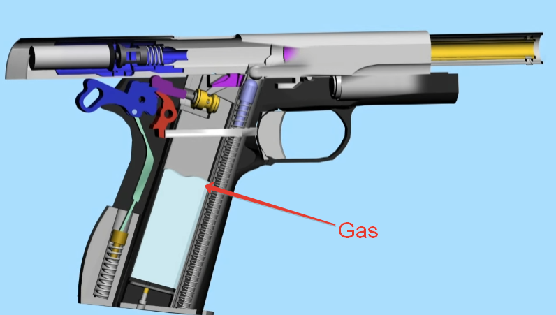 Когда страйкер нажимает на спусковой крючок газового пистолета, запускается ударно-спусковой механизм, который бьет по штоку выпускного клапана магазина. Он приоткрывает герметичный газовый резервуар.