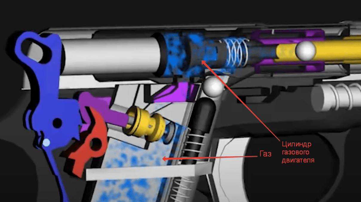 Итак, газ попал в газовый двигатель и стремится в сторону ствола, тем самым толкая шар. Он набирает скорость и вылетает из ствола пистолета.