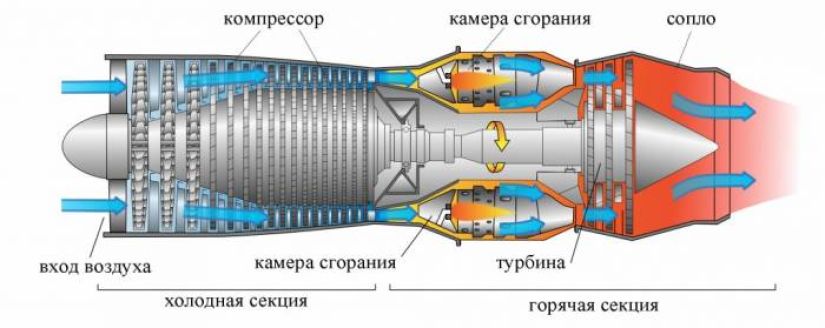 Таким образом, любой тепловой двигатель должен иметь устройство для сжатия, нагреватель, устройство для расширения и охлаждения. Все это есть у ТРД, соответственно: компрессор, камера сгорания, турбина, а в роли холодильника выступает атмосфера.