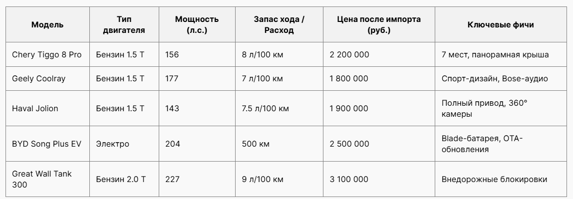 Сравнительная таблица ключевых моделей авто из Китая по цене, мощности и пробегу.