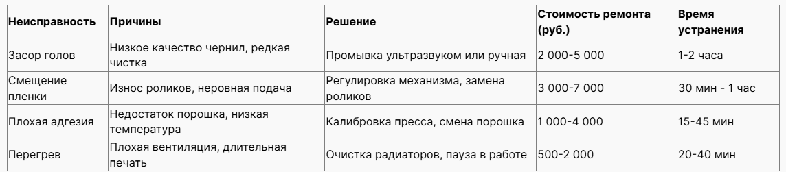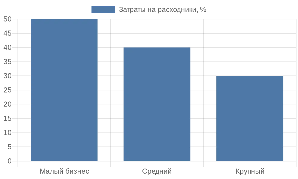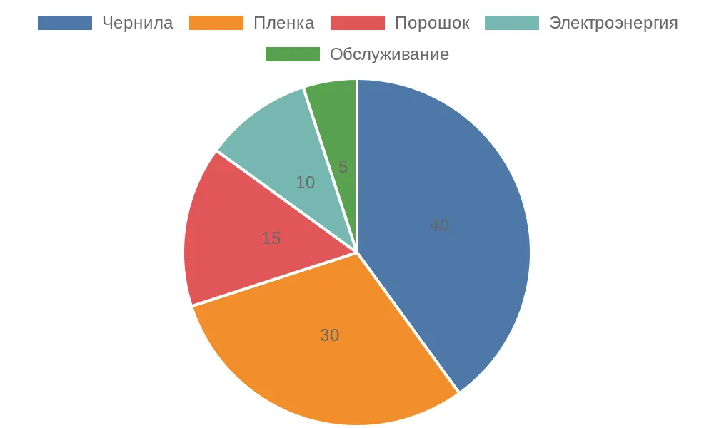 Эта диаграмма показывает типичное распределение затрат для среднего бизнеса в России, где чернила и пленка доминируют. Анализируя такие пропорции, вы сможете спланировать бюджет точнее, избегая неожиданных трат на ремонт.