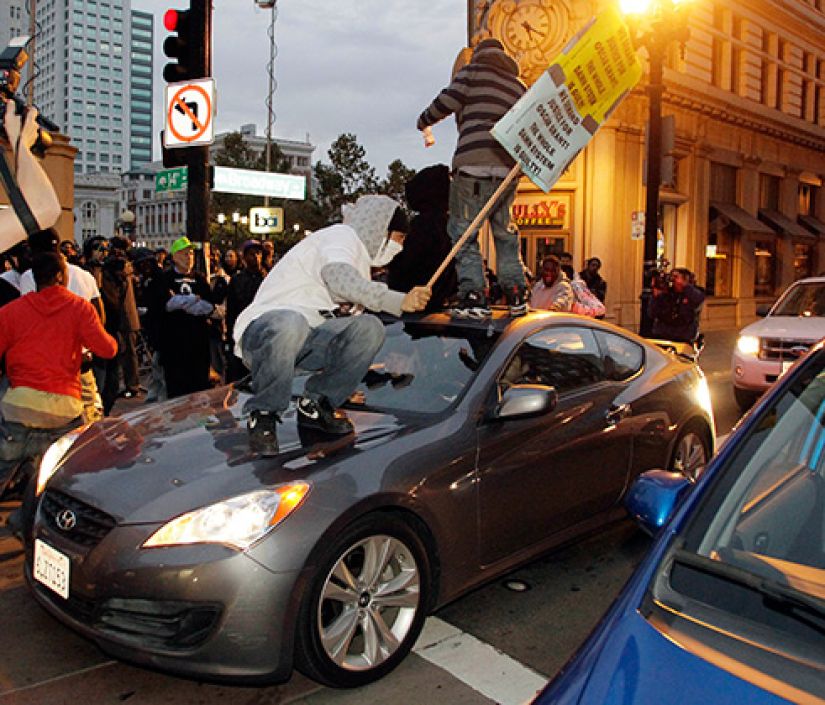 Впервые это произошло в 2010 году. Как и в случае с Родни Кингом, поводом для беспорядков стал приговор белому полицейскому Йоханнесу Мезерле. На скамье подсудимых он оказался после того, как 1 января 2009-го застрелил 22-летнего чернокожего по имени Оскар Грант. Произошло это при следующих обстоятельствах: наряд полиции был вызван на вокзал Окленда (штат Калифорния), чтобы разнять драку пассажиров пригородного поезда. Когда участники потасовки уже были выведены из вагона, один из них — Грант — продолжал вести себя буйно. Как объяснял на суде Мезерле, успокоить бузотера он хотел выстрелом из тайзера (электрошокера), но по ошибке пустил в ход боевой пистолет. Его слова некоторым образом подтверждала видеозапись, сделанная свидетелем происшествия: на ней видно, как офицер, сделав выстрел, изумленно отскакивает, подняв руки вверх. Присяжные озвученной Мезерле версии поверили, классифицировав убийство как несчастный случай. В результате вместо 14 лет подсудимый получил минимальный срок — два года лишения свободы. После оглашения приговора в городе начались беспорядки. Негры крушили полицейские машины и грабили магазины. Ситуация нормализовалась лишь после того, как 120 погромщиков были арестованы.