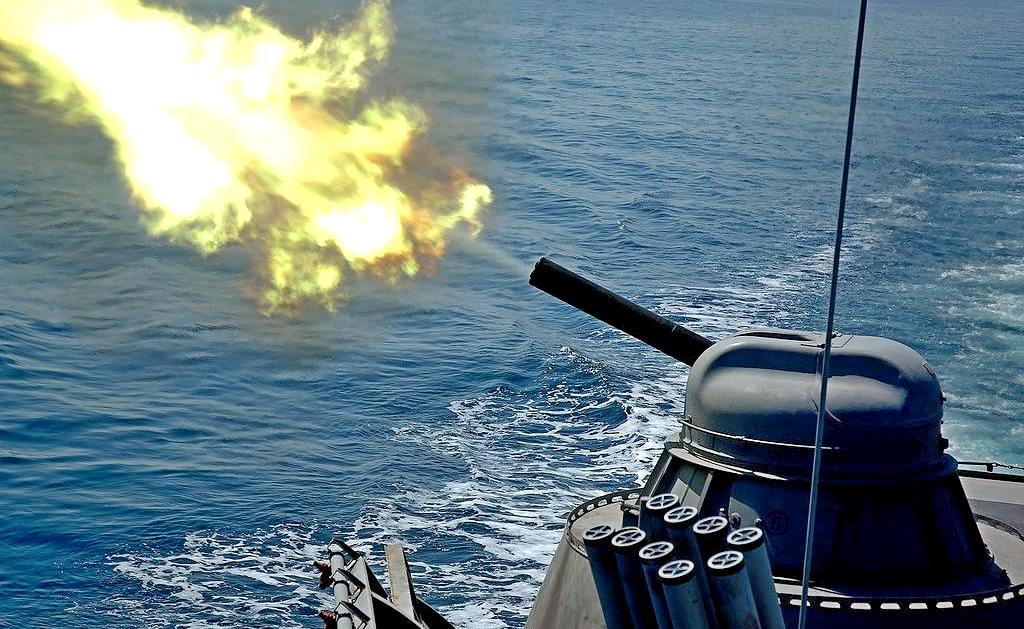 Ведь кроме «Гранитов» на крейсере стоял целый арсенал: 96 ракет зенитно-ракетного комплекса ПВО дальней зоны поражения «Форт» - аналог сухопутного С-300, 128 ракет ЗРК «Кинжал» - аналог «Тора», 2 пусковые установки комплекса противолодочной обороны «Водопад». Несколько шестиствольных суперскорострельных пушек АК-630 (на фото выше), ласково называемые моряками «металлорезками». Каждая из них делает более 1000 выстрелов в минуту, из-за чего они, в буквальном смысле, режут цель на кусочки. В арсенале крейсера предусмотрено и чисто артиллерийское вооружение - автоматическая двуствольная пушка АК-130 (на фото ниже), системы залпового огня по типу сухопутных «катюш» для борьбы с подводными лодками противника и морскими диверсантами.