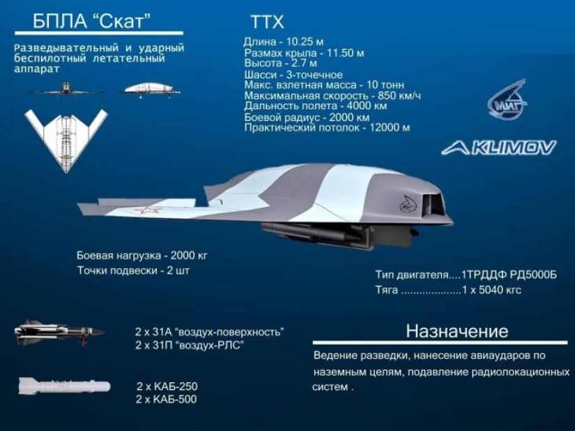 По заявлению разработчиков, «Скат» предназначен для нанесения ударов как по заранее разведанным стационарным целям, в первую очередь средствам ПВО, в условиях сильного противодействия зенитных средств противника, так и по мобильным наземным и морским целям при ведении автономных и групповых, совместных с пилотируемыми летательными аппаратами действий. Его максимальная взлетная масса должна составить 10 тонн. Дальность полета - 4 тыс. километров. Скорость полета у земли - не менее 800 километров в час. Он сможет нести две ракеты класса «воздух-поверхность»/»воздух-РЛС» или две корректируемые авиабомбы общей массой не более 1 тонны.