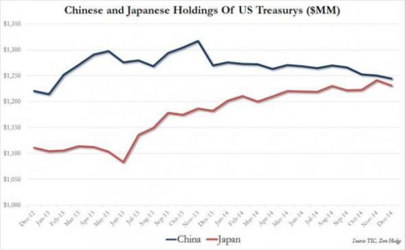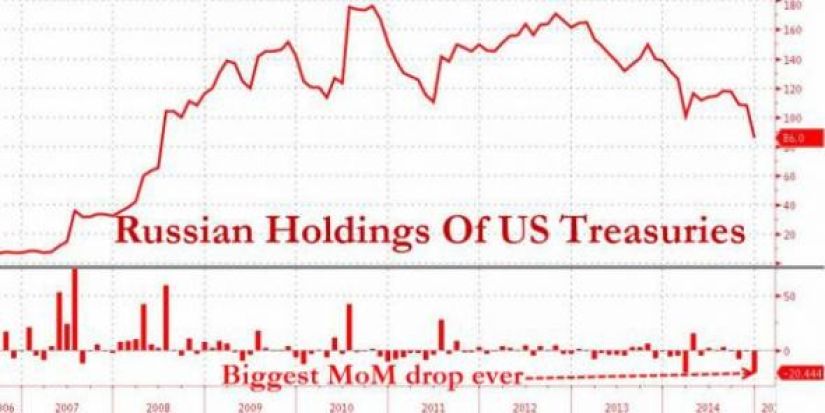 Как сообщают аналитики, Россия "слила" в последнем месяце американских казначейских обязательств на сумму $22 миллиарда долларов — это исторический рекорд. "Осталось $86 миллиардов", пишут они и отмечают, что это "минимальный уровень с июня 2008 года". Кстати, американские ГКО сбрасывала не только Россия, но и Китай. КНР также продало трейжерс на $6 миллиардов и "уступил бы первое место иностранца-держателя Японии" но...