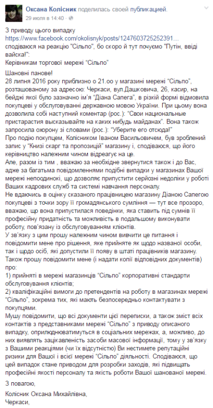 Об инциденте на своей странице в социальной сети возмущённо сообщила супруга скандалиста Оксана Колиснык, который «просто селёдочки хотел купить». Что самое интересное, больше всего так называемую патриотку возмутило поведение окружающих. Барышня не смогла понять, почему же подавляющее большинство смотрели на них, как на прокажённых, и сочувствовали именно кассирше.