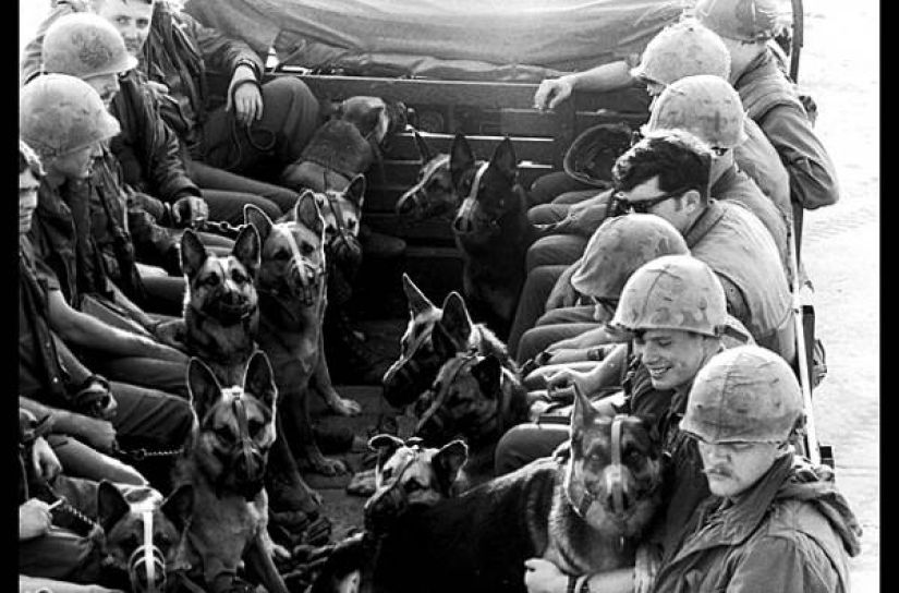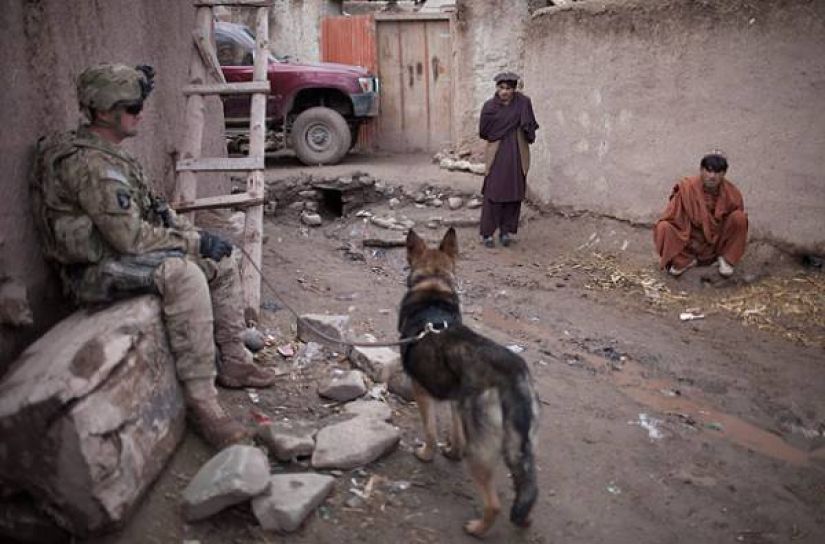 Морской пехотинец США опирается на свою собаку по кличке Патрик.