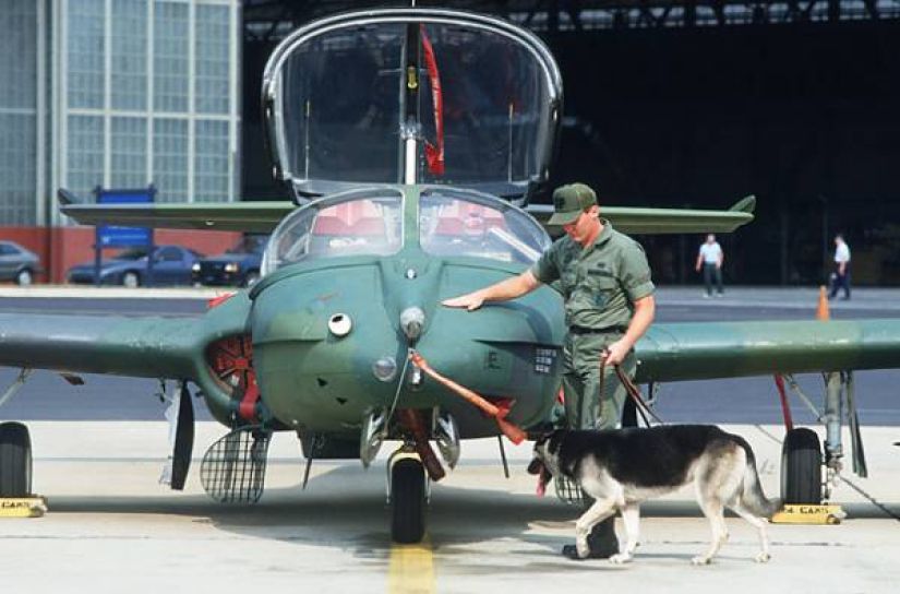 Солдат ВВС США использует обученную собаку для проверки самолета вблизи Панамского канала.